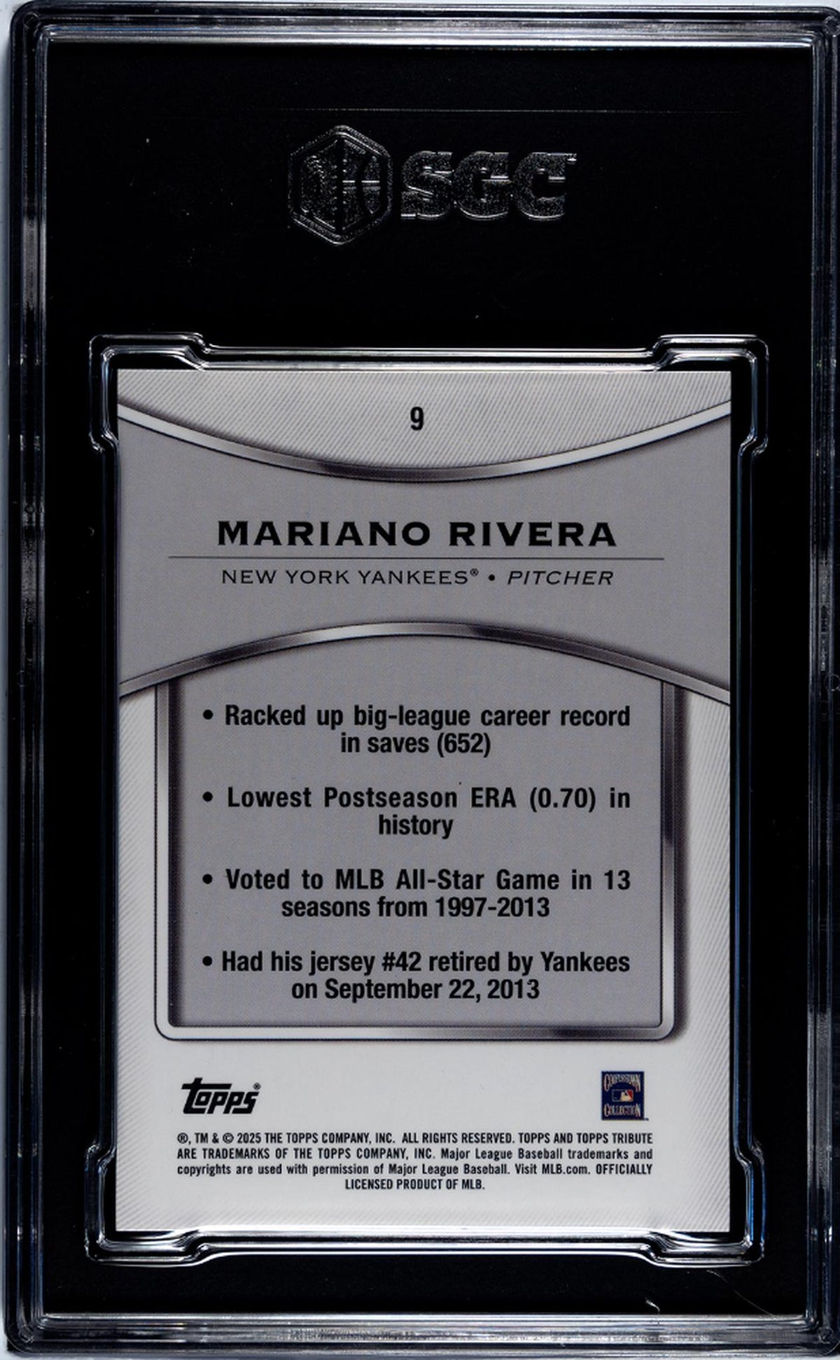 In conclusion, this Mariano Rivera card from the 2025 Topps Tribute set is more than just a collectible. It's a tribute to a baseball legend, a specimen of superior quality, and a tangible piece of MLB history. A perfect gift for yourself or the passionate sports enthusiast in your life. Own this card and own a piece of the illustrious legacy of Mariano Rivera.
